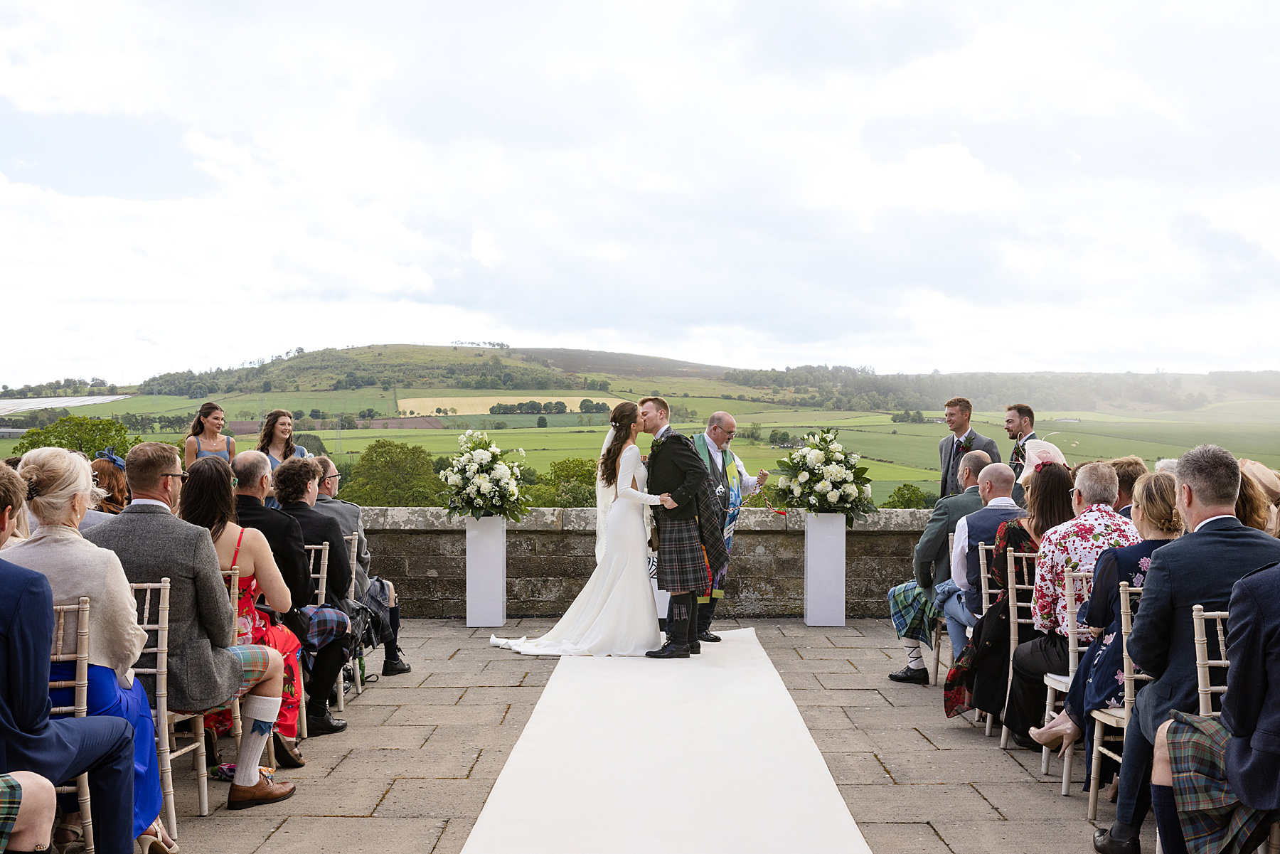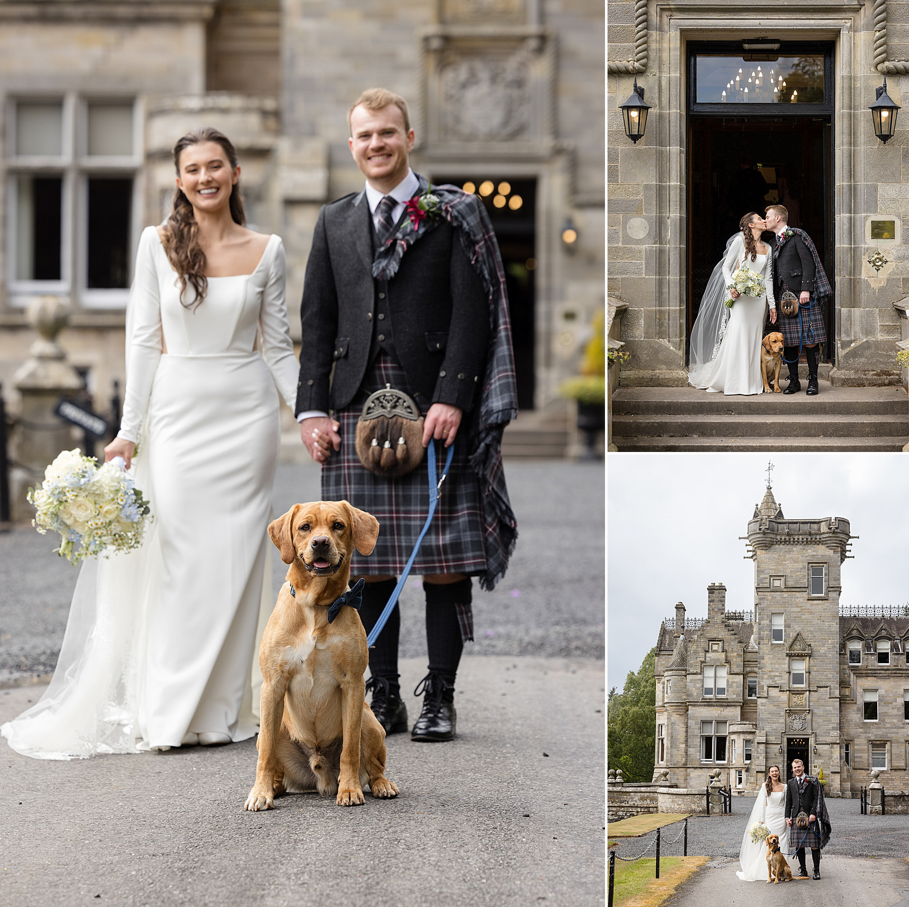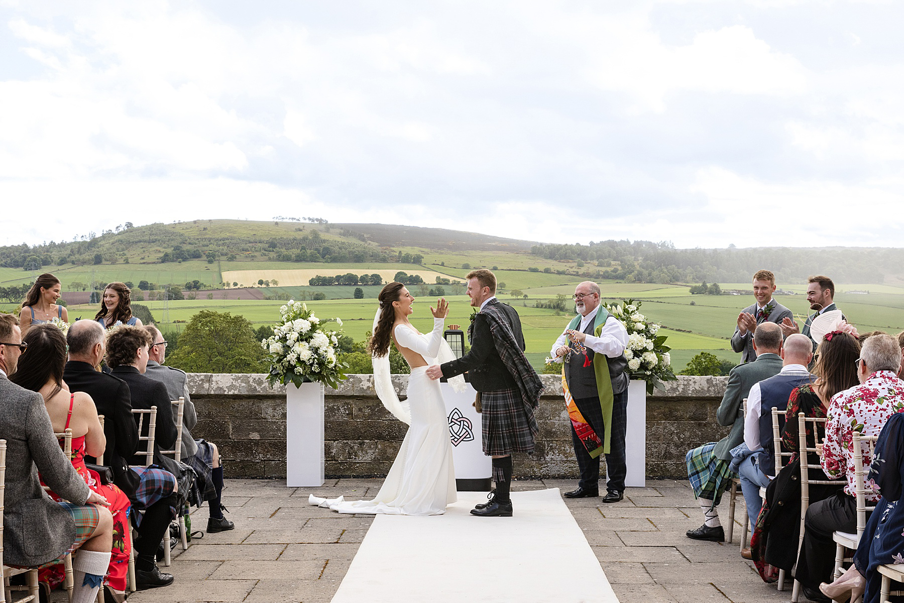 Alison and Ewan have so many highlights of their wedding day. Of course time with Sully is up there, but they also treasured their outdoor ceremony, from Alison’s epic aisle walk through to their vows, first kiss and quaich ceremony. With the added backdrop of the sky capturing all seasons, it was Scottish wedding magic right there.